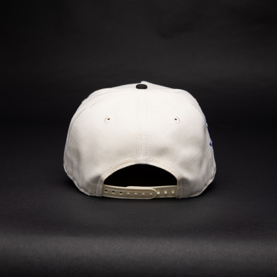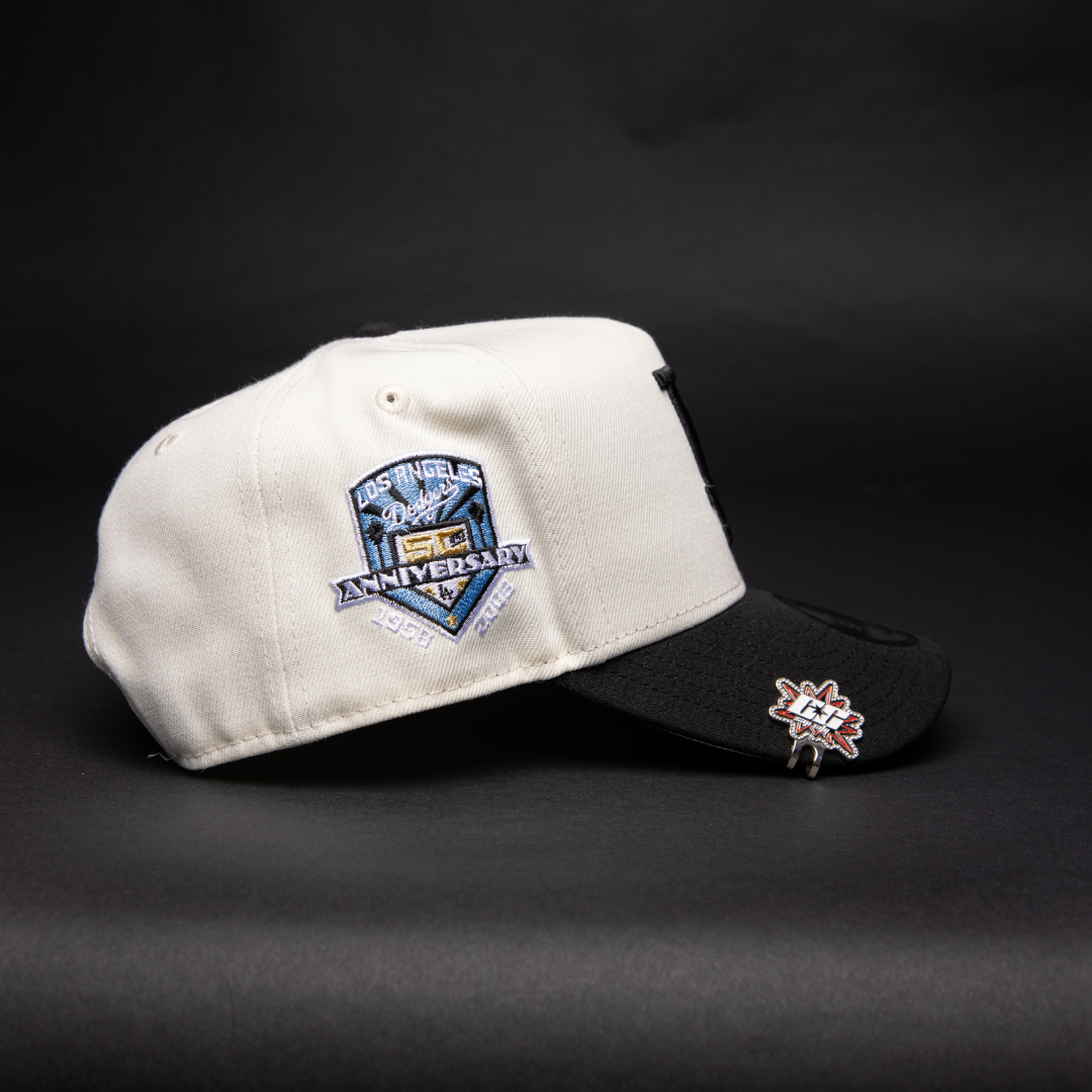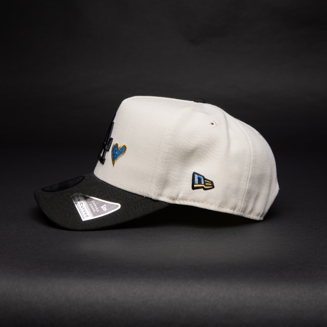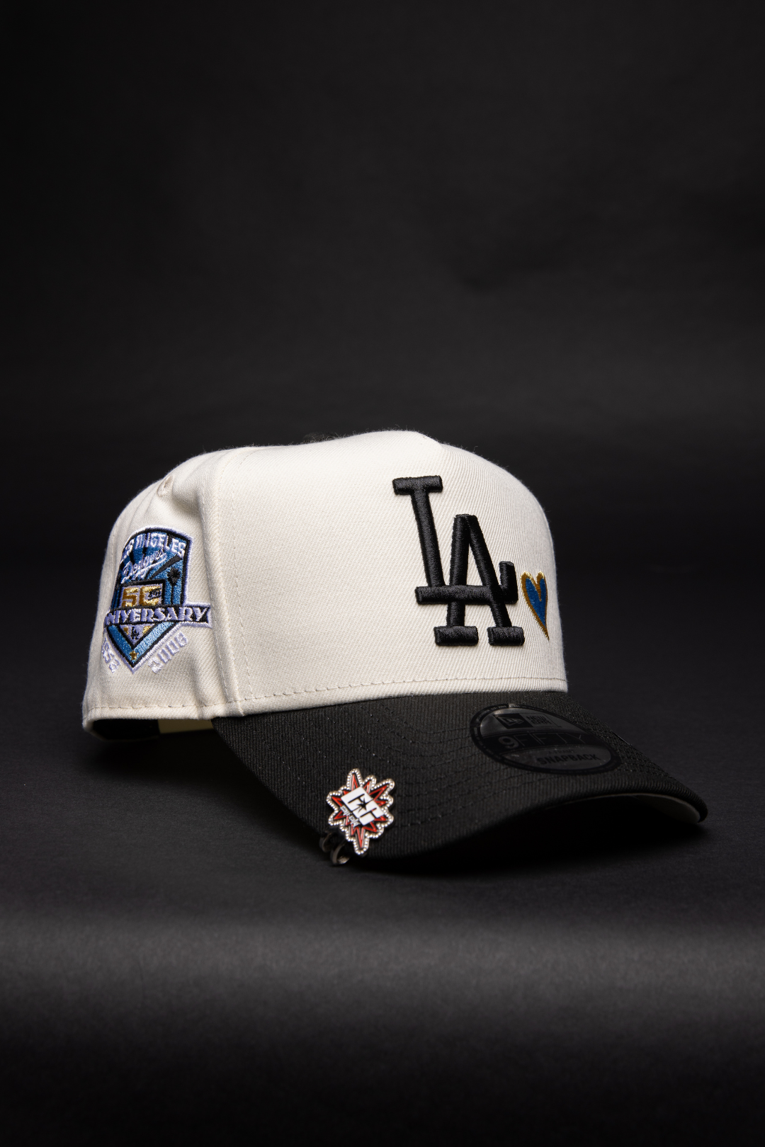 NEW ERA 9FIFTY A-FRAME CHROME/ BLACK LOS ANGELES DODGERS SNAPBACK W/ HEART + 50TH ANNIVERSARY SIDE PATCH