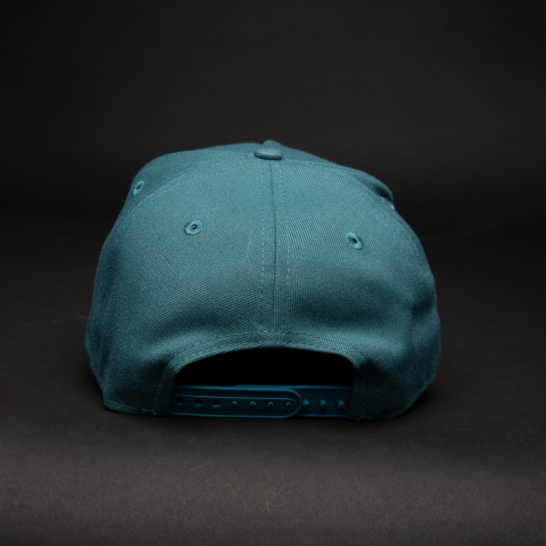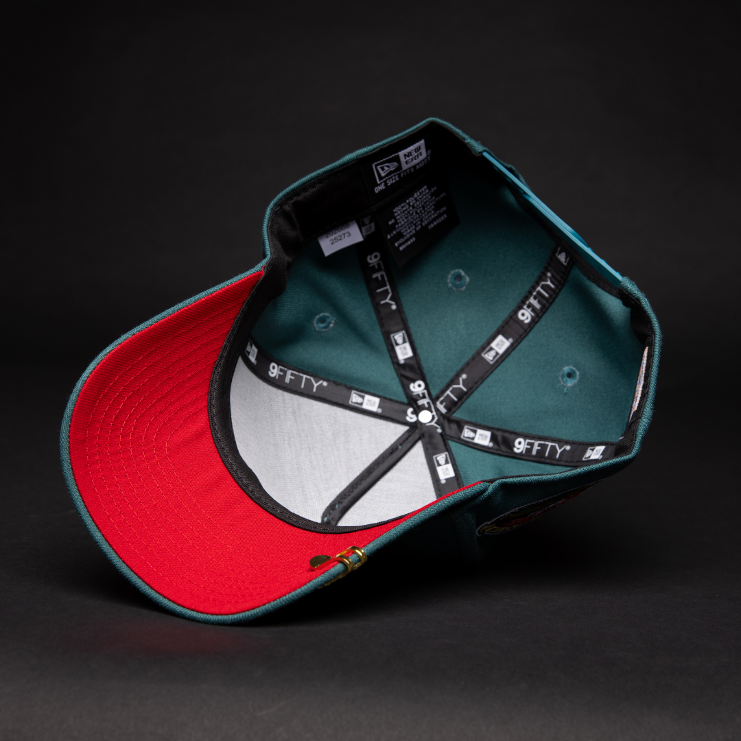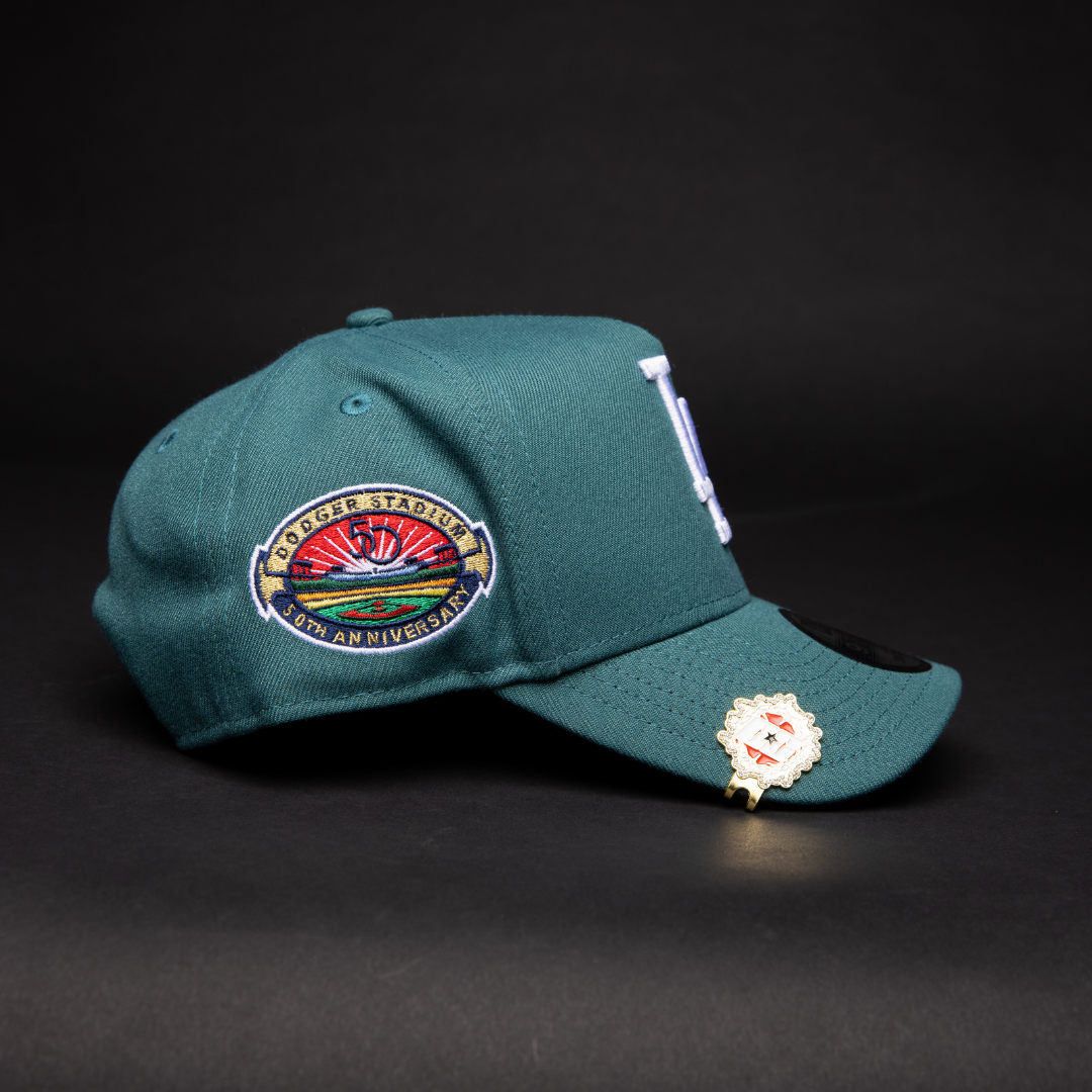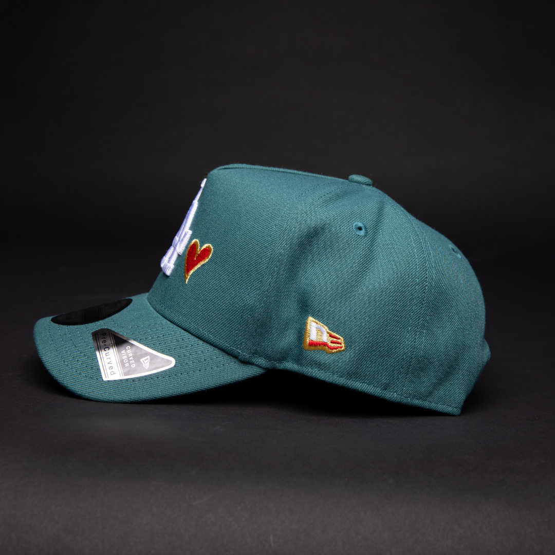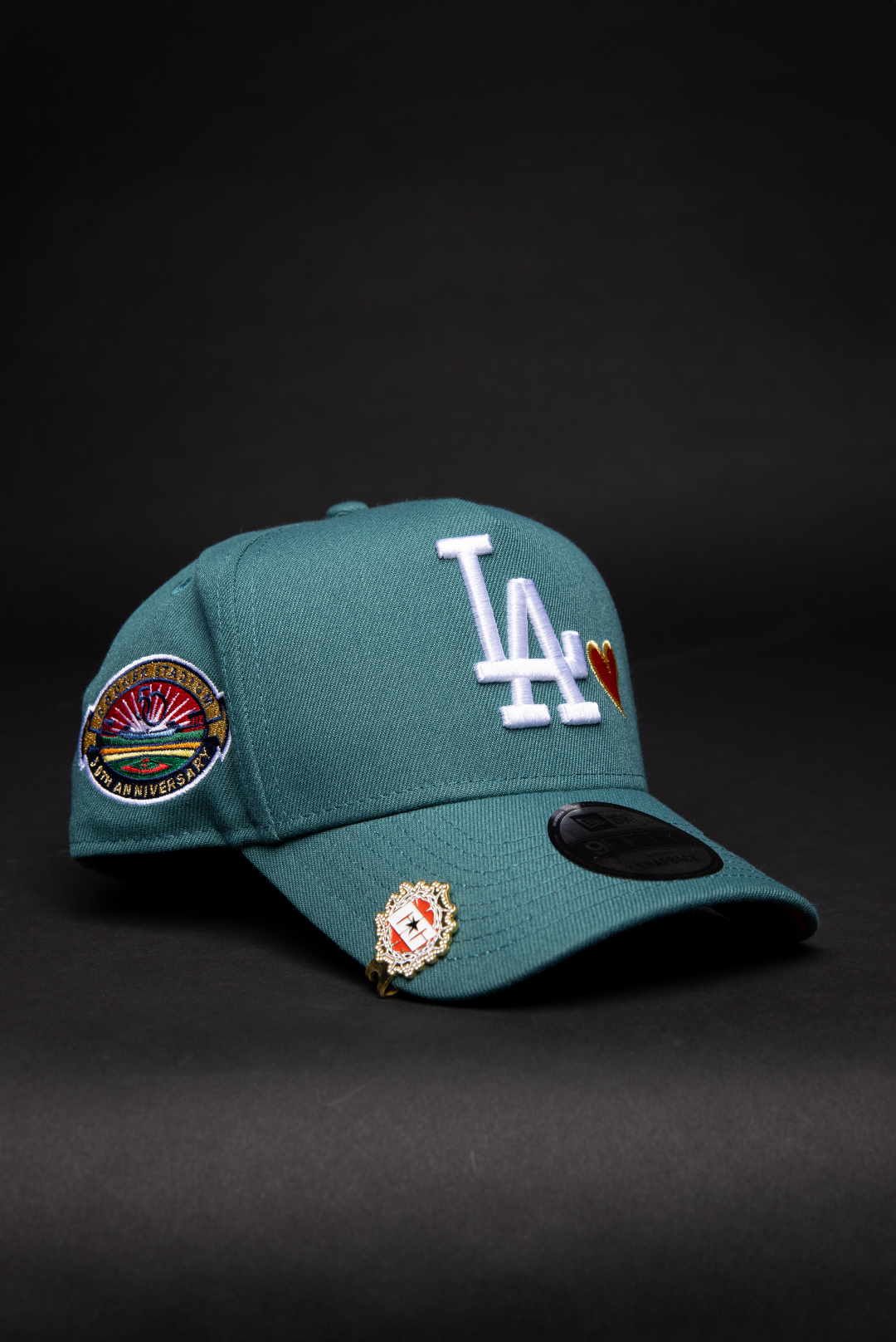 NEW ERA 9FIFTY A-FRAME PINE GREEN LOS ANGELES DODGERS SNAPBACK W/ RED HEART + 50TH ANNIVERSARY SIDE PATCH