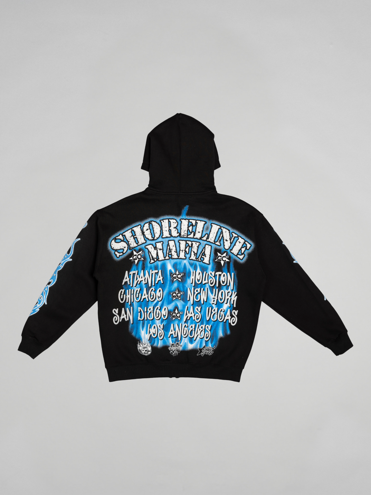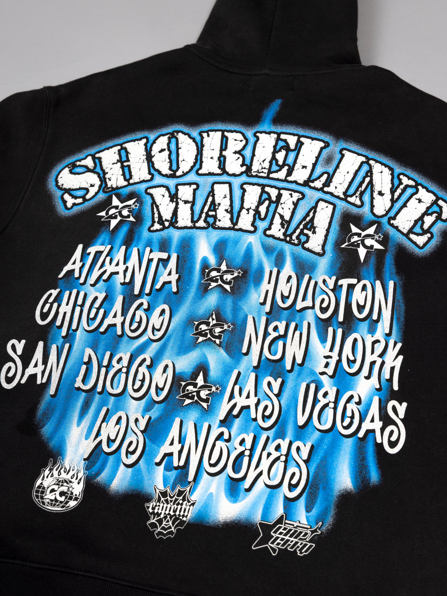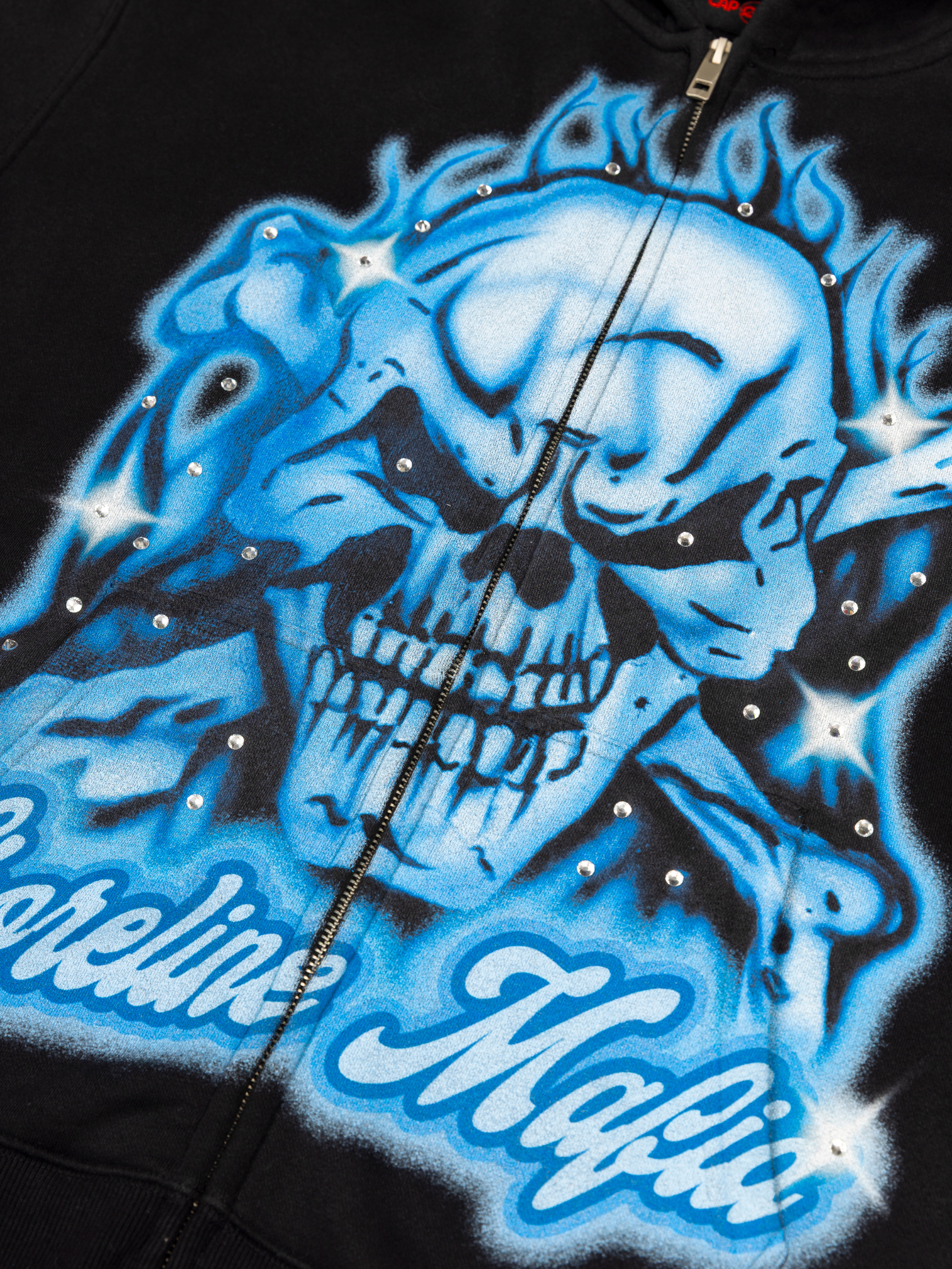 CAP CITY X SHORELINE MAFIA BLACK/BLUE AIR BRUSH ZIP UP HOODIE W/ RHINESTONES - UNISEX