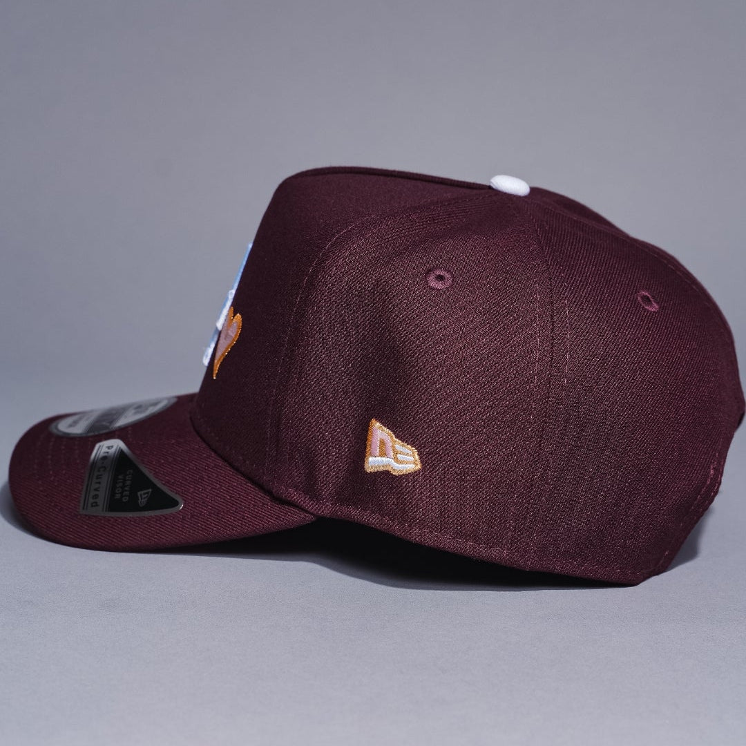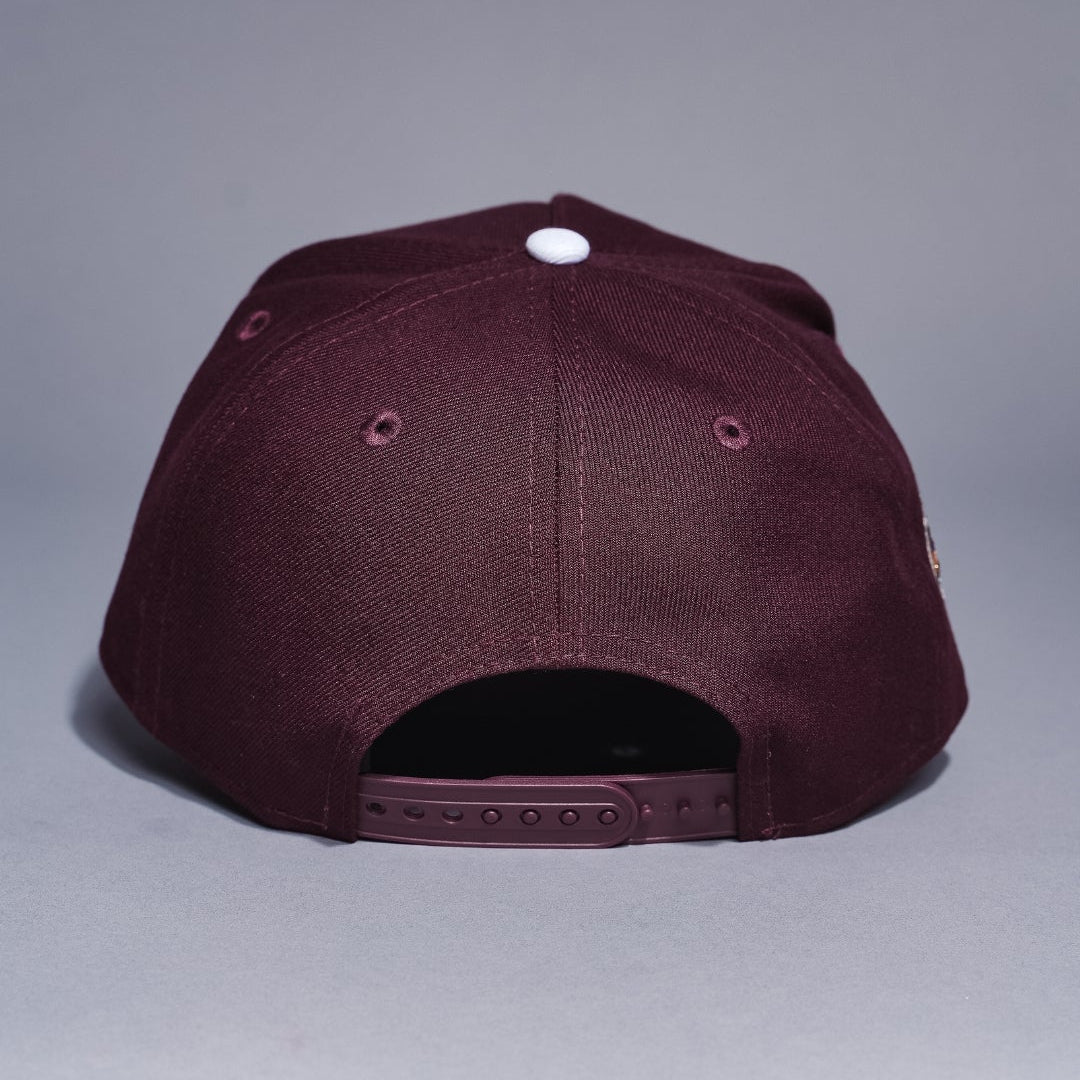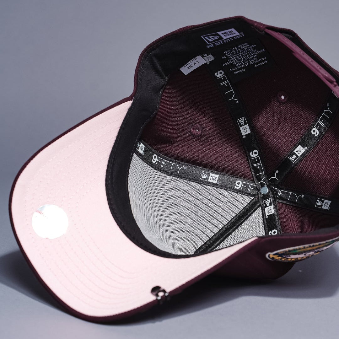 NEW ERA 9FIFTY A-FRAME BURGUNDY LOS ANGELES DODGERS SNAPBACK W/ HEART + 50TH ANNIVERSARY SIDE PATCH