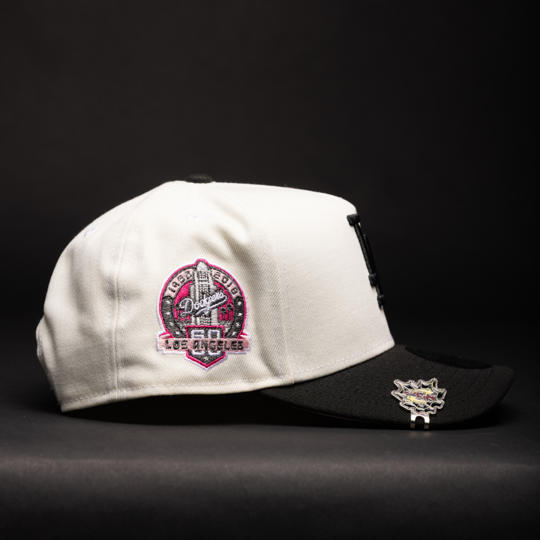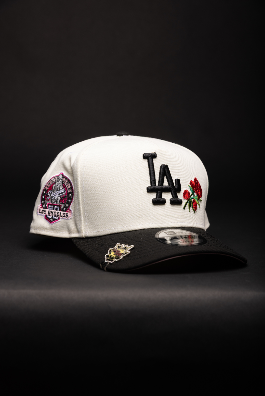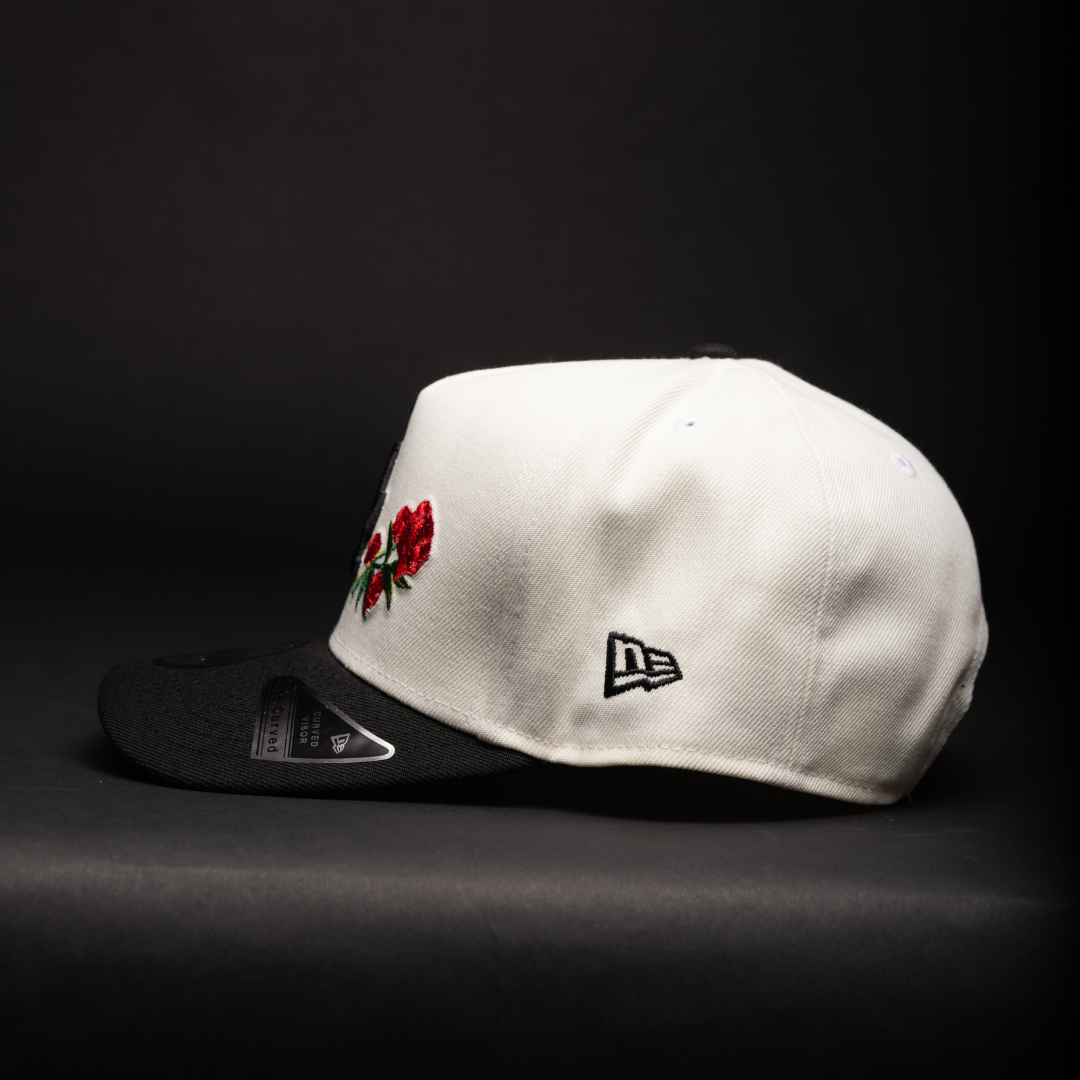 NEW ERA 9FIFTY A-FRAME CHROME/BLACK LOS ANGELES DODGERS W/ RED ROSES + 60TH ANNIVERSARY SIDE PATCH