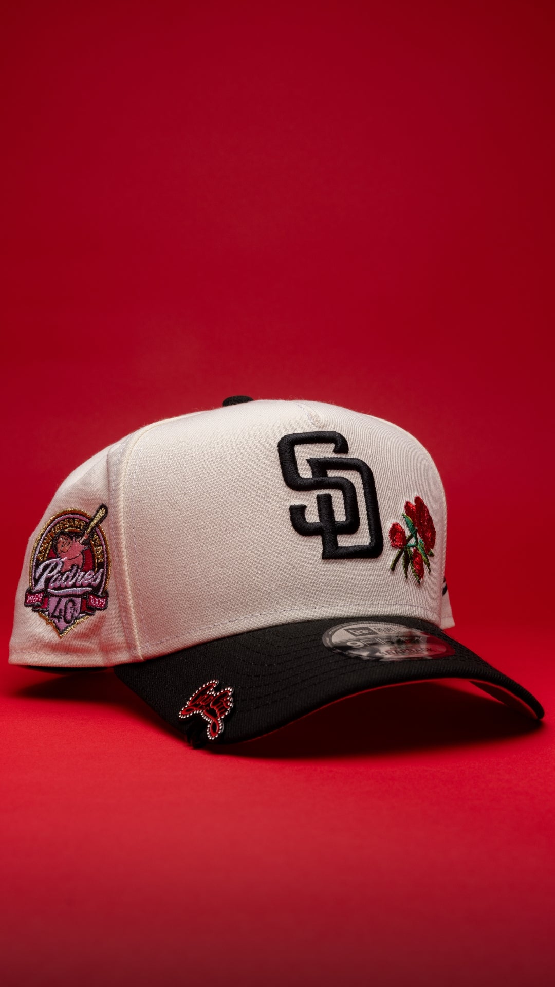 NEW ERA 9FIFTY A-FRAME CHROME/BLACK SAN DIEGO PADRES SNAPBACK W/ RED ROSES + 40TH ANNIVERSARY SIDE PATCH
