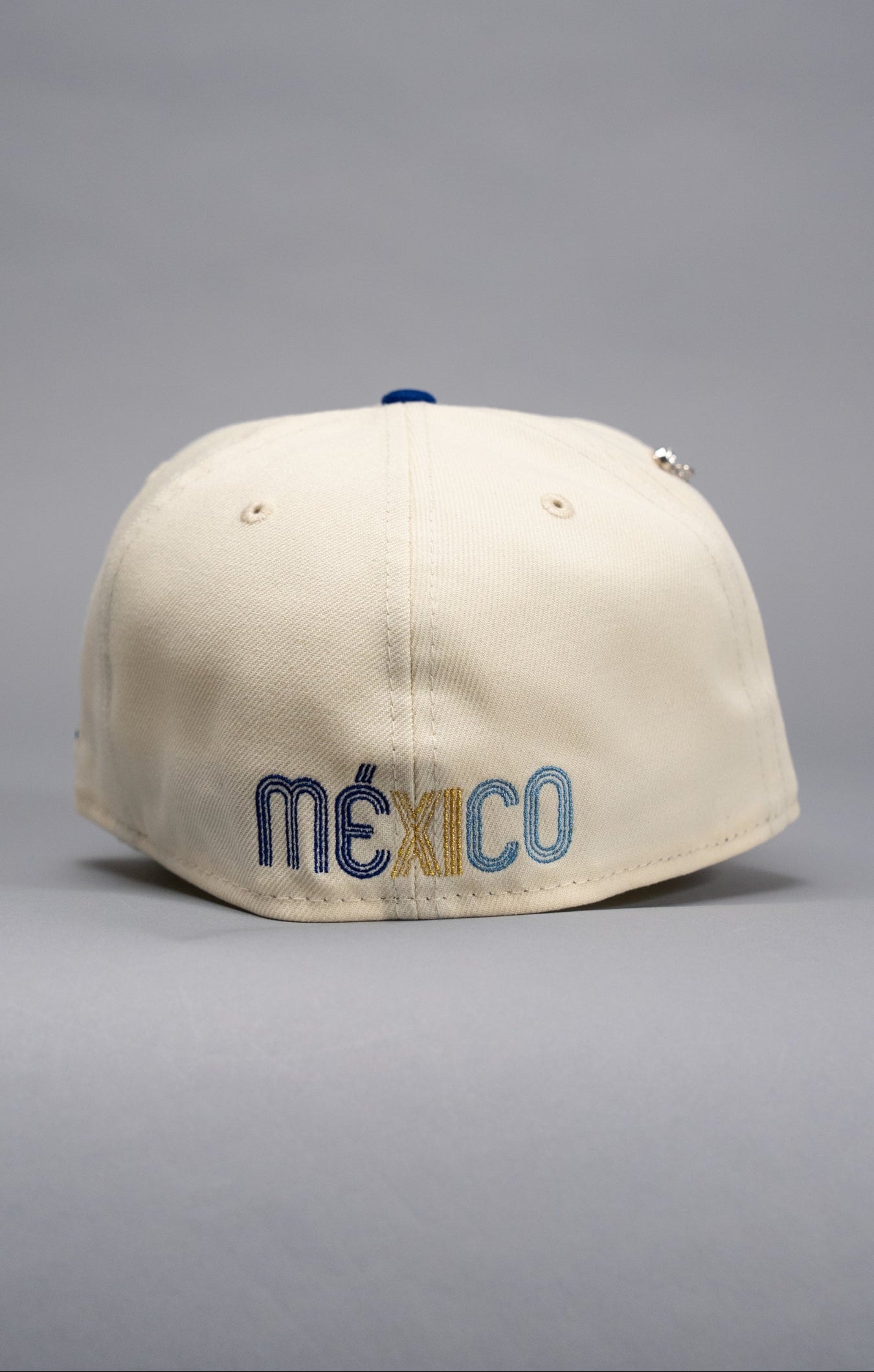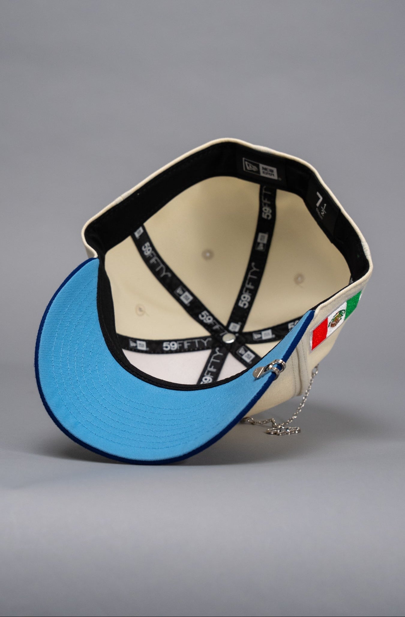 NEW ERA EXCLUSIVE 59FIFTY CHROME/BLUE MEXICO 2025 WORLD BASEBALL CLASSIC W/ MEXICO FLAG SIDE PATCH