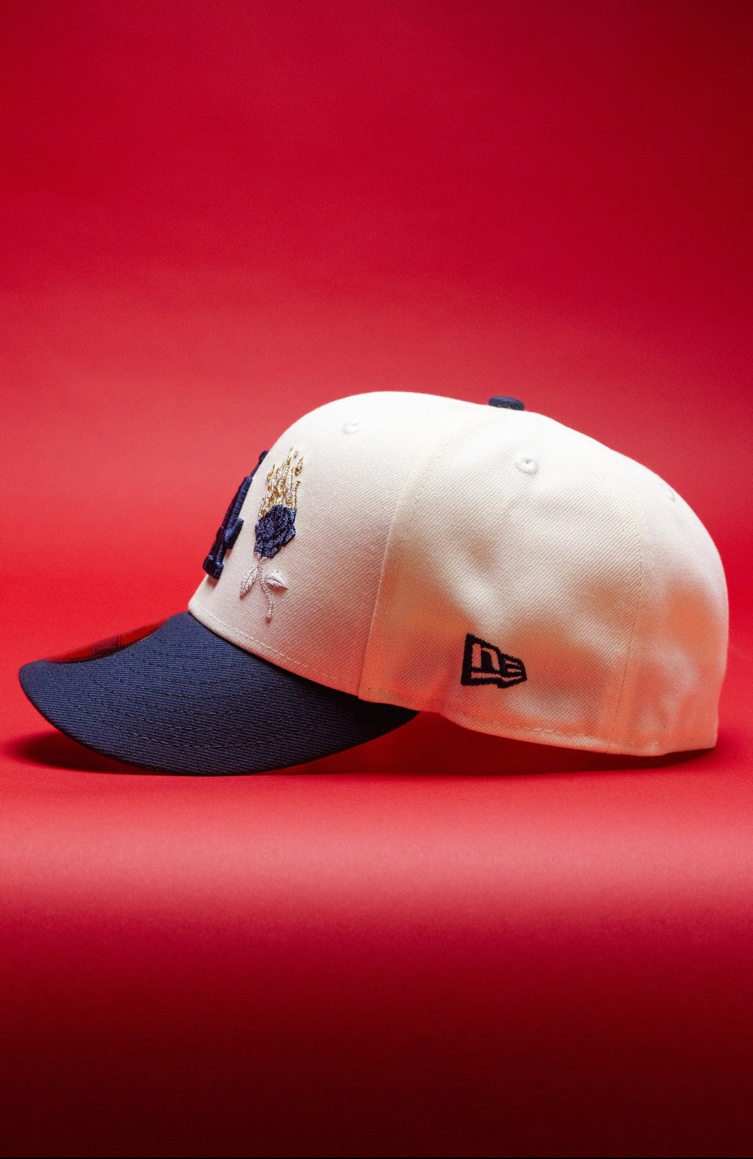 NEW ERA EXCLUSIVE 59FIFTY CHROME/NAVY LOS ANGELES DODGERS W/ BURNT ROSES + 2024 WORLD SERIES SIDE PATCH