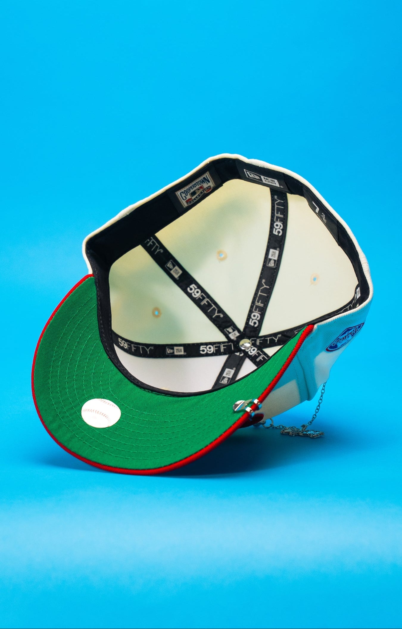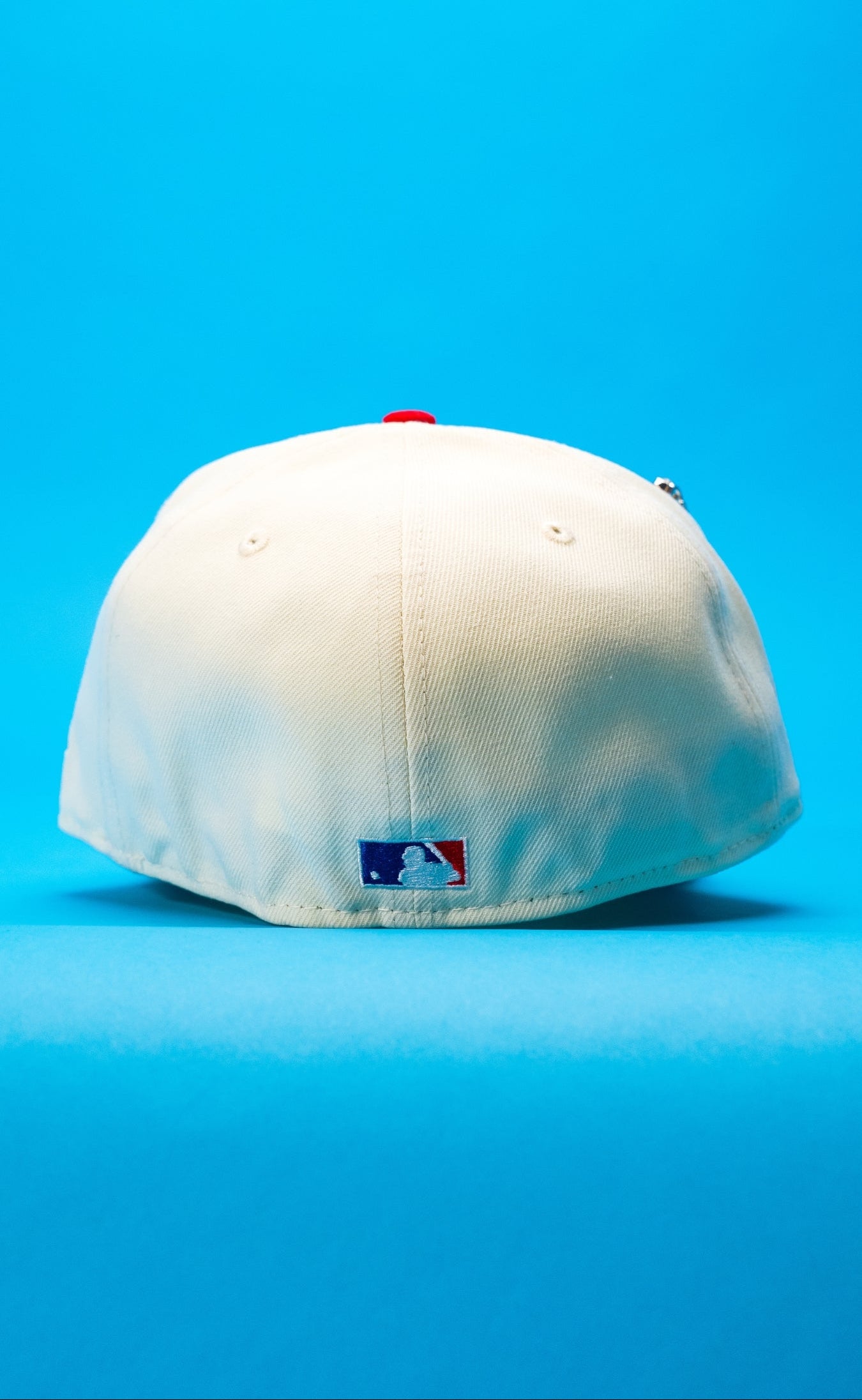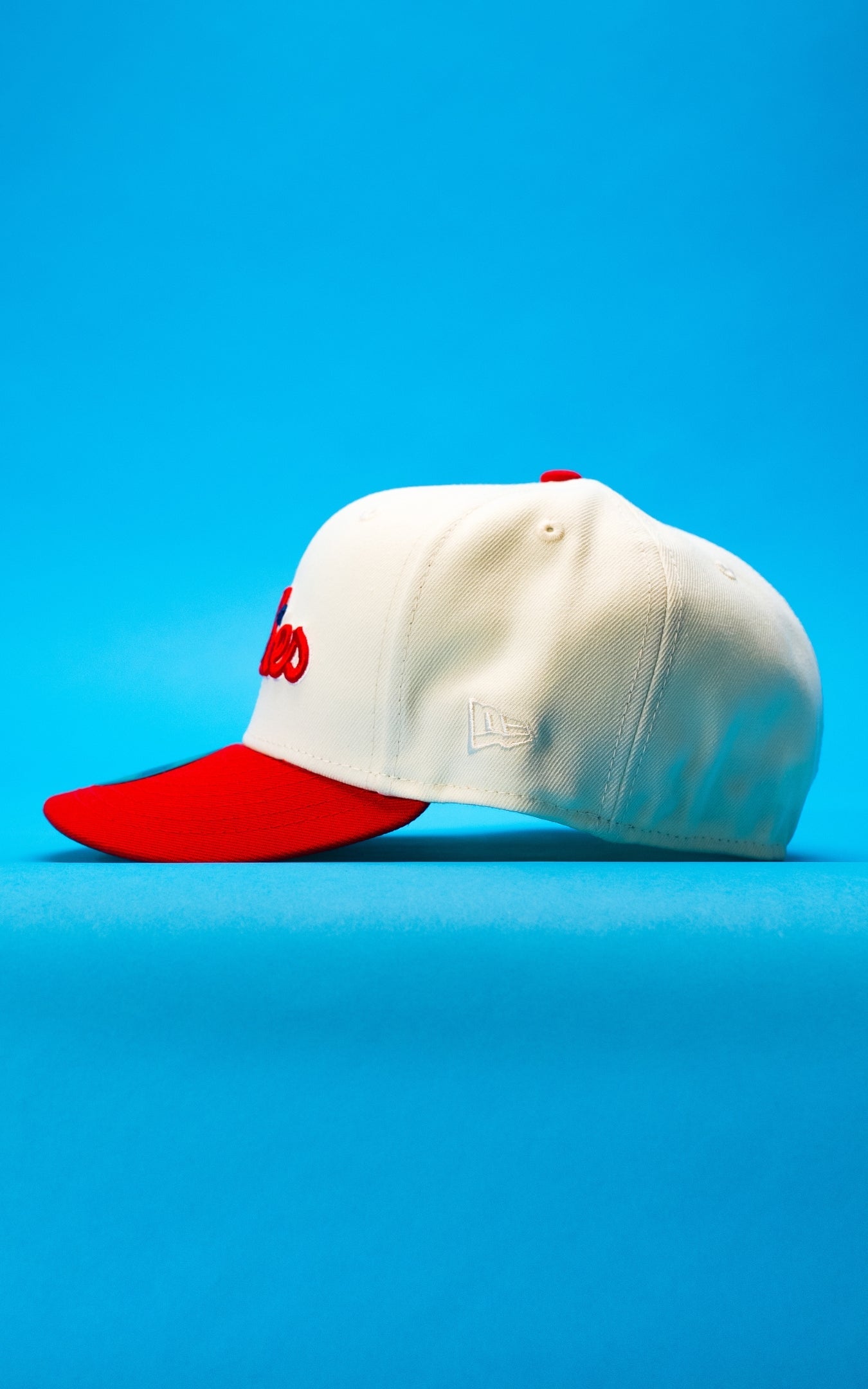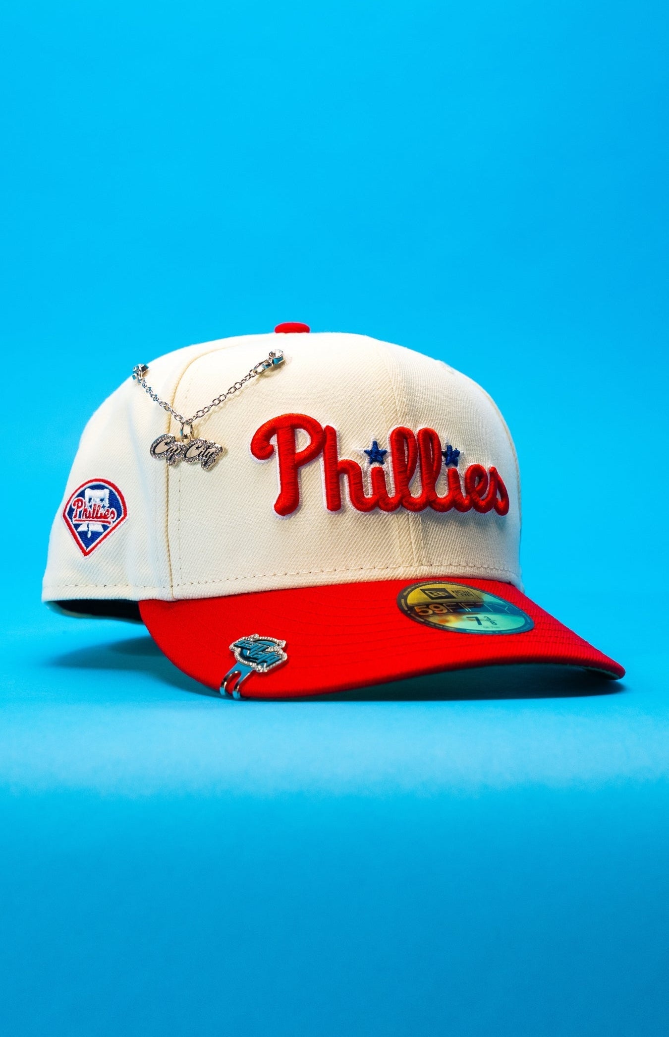 NEW ERA EXCLUSIVE 59FIFTY CHROME/RED PHILADELPHIA PHILLIES SCRIPT W/ "PHILLIES" LOGO SIDE PATCH